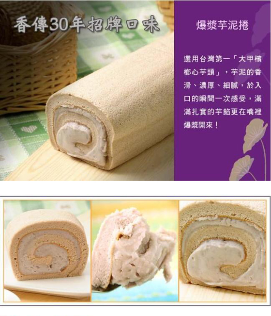 超人氣糕點名店【香帥蛋糕】,金字招牌爆漿芋香捲/芋泥蛋糕,堅持選用天然優等芋頭,產自高雄的甲仙芋與台中的大甲芋,嚴謹工法多工處理,讓食材的原味甘甜徹底展現,滿滿的芋泥餡,綿密之中還能吃到芋頭顆粒,幸福到簡直叫人瘋狂。